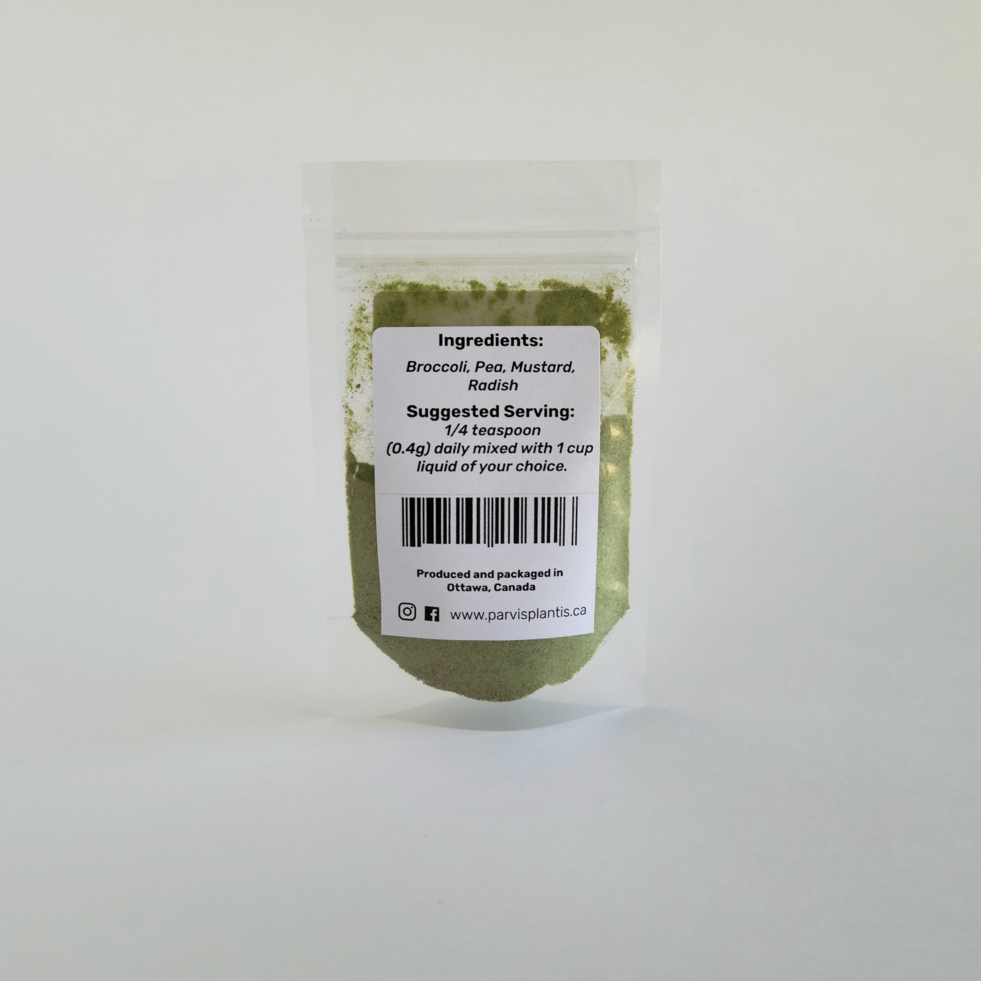 Our freeze dried microgreen powder is manufactured using a process that retains 98% of their original nutrient content. Every step of the process is done locally from our grow room here in Ottawa. From organic certified seeds to the finely milled powder. Our products are always free of any additives and are grown using low power LED lights, pure water, and an organic certified medium. 1/4 teaspoon of microgreens powder has the same nutritional value as a handful of fresh microgreens. A day's worth of veggie nutrients is compressed into that 1/4 tsp of freeze dried microgreens.
